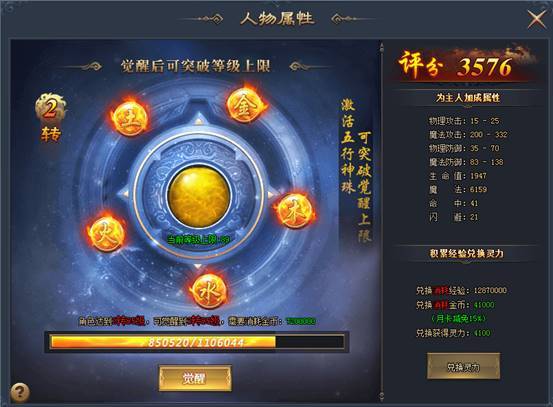 a) 需要消耗经验、金币兑换灵力激活五行神珠,可突破等级上限